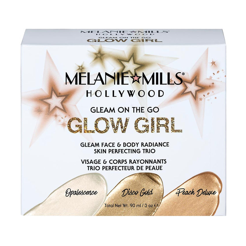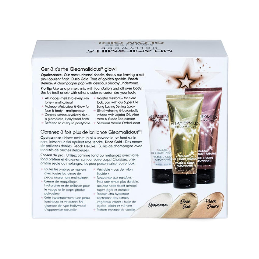 Get 3 times the glamorous glow with the Glow Girl face and body glow kit at a savings! This kit includes three 1oz/30ml sizes of the lighter shades of Gleam Face & Body Radiance: Opalescence, Disco Gold, and Peach Deluxe. Usually $54 when bought separately, this kit is only $41!